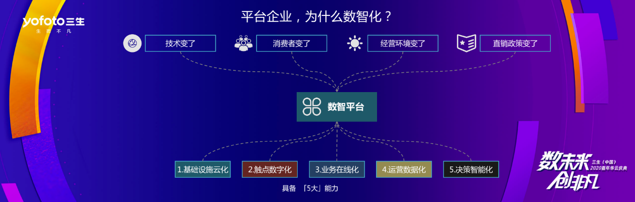 企业数字化转型构建的数智平台让人与人之间,人与信息之间、信息与信息之间拉近了距离和体验,从而实现基础设施云化、触点数字化、业务在线化、运营数据化、决策智能化,让三生平台与生态共同成长。